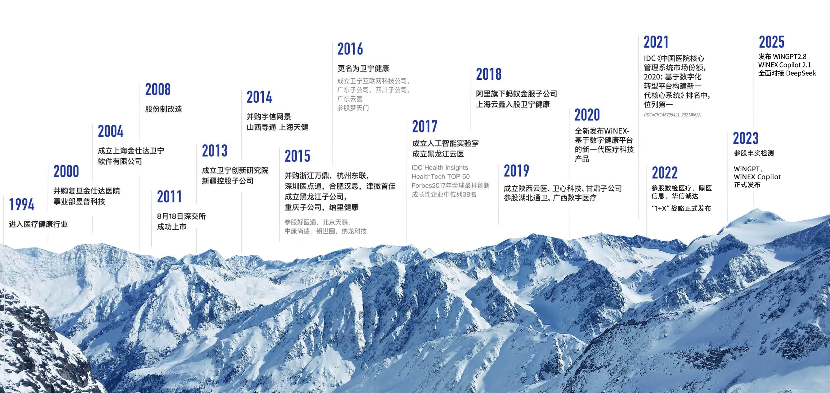 2020年4月,卫宁健康发布了具有行业引领意义的新一代产品WiNEX。2021年4月发布WiNEX 2021系列、智慧医院、智慧公卫等多个应用场景智慧解决方案。2022年6月发布医护移动工作平台WiNEX MY,助力医生个人成长。 卫宁健康在AI+医疗领域布局深远,于2017年成立卫宁健康人工智能实验室,2023年10月重磅发布基于通用模型的医疗垂直领域大模型WiNGPT与医疗智能助手WiNEX Copilot。2024年发布WiNGPT 2.6,并在北京大学人民医院、上海市肺科医院、上海市同济医院等多家三甲医院落地应用。2025年初发布WiNGPT 2.8和医护智能助手WiNEX Copilot 2.1,支持覆盖诊前、诊中、诊后和医疗管理30多个场景,并全面对接DeepSeek,WiNEX以AI增强为新的动力,正逐步成为医护人员不可或缺的智能诊疗助手。 卫宁健康注重技术创新与人才培养,常年与全国顶级高等院校及科研机构保持“产学研”紧密合作,先后与上海交通大学合作建立了“上海交大-卫宁健康人工智能联合实验室”;与合肥工业大学、安徽医科大学第一附属医院、中国科学院大学经济与管理学院共同成立了"医疗健康管理联合研究中心";与上海健康医学院共建“健康-卫宁未来医院发展研究中心”;与复旦大学数学科学学院建立了战略合作关系,分别开展对AI、大数据、云计算、物联网、移动互联网等方面的前沿研究。